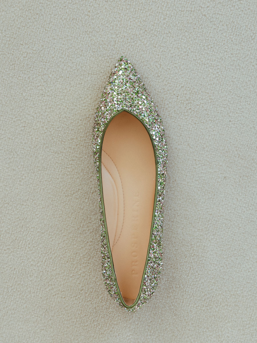 Obermaterial aus Leder mit grünen Strassteinen besetzt