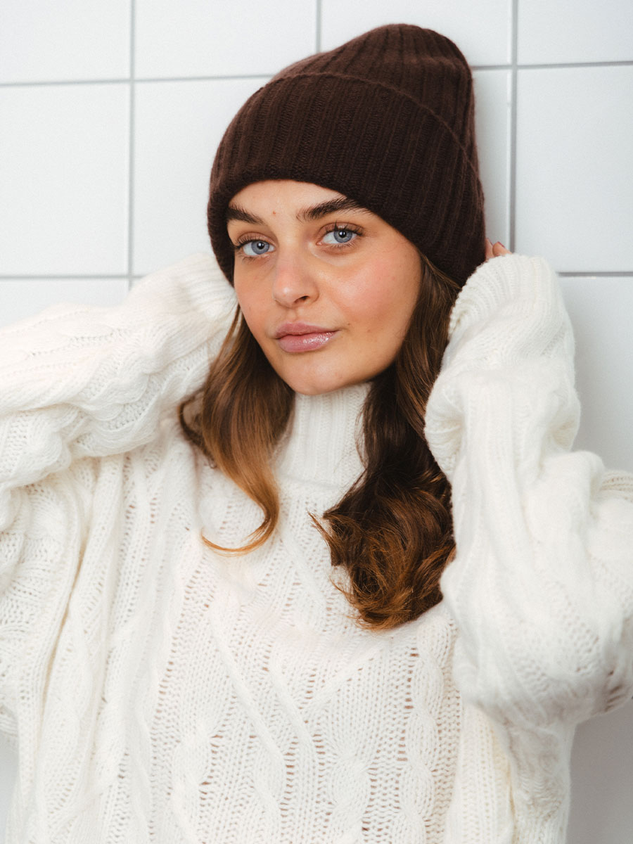 in Dunkelbraun Feinstrick umgeschlagener Saum, kann auch offen getragen werden hochwertiger Kaschmir von Hand gefertigt
