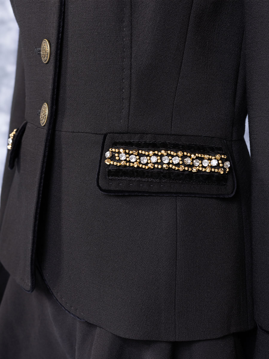 Verzierungen mit Glassteinen und vergoldeten Perlen an Taschen und Kragen