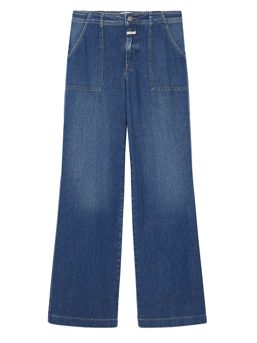 Passform: flared Schnitt, sitzt hoch, langes Bein.