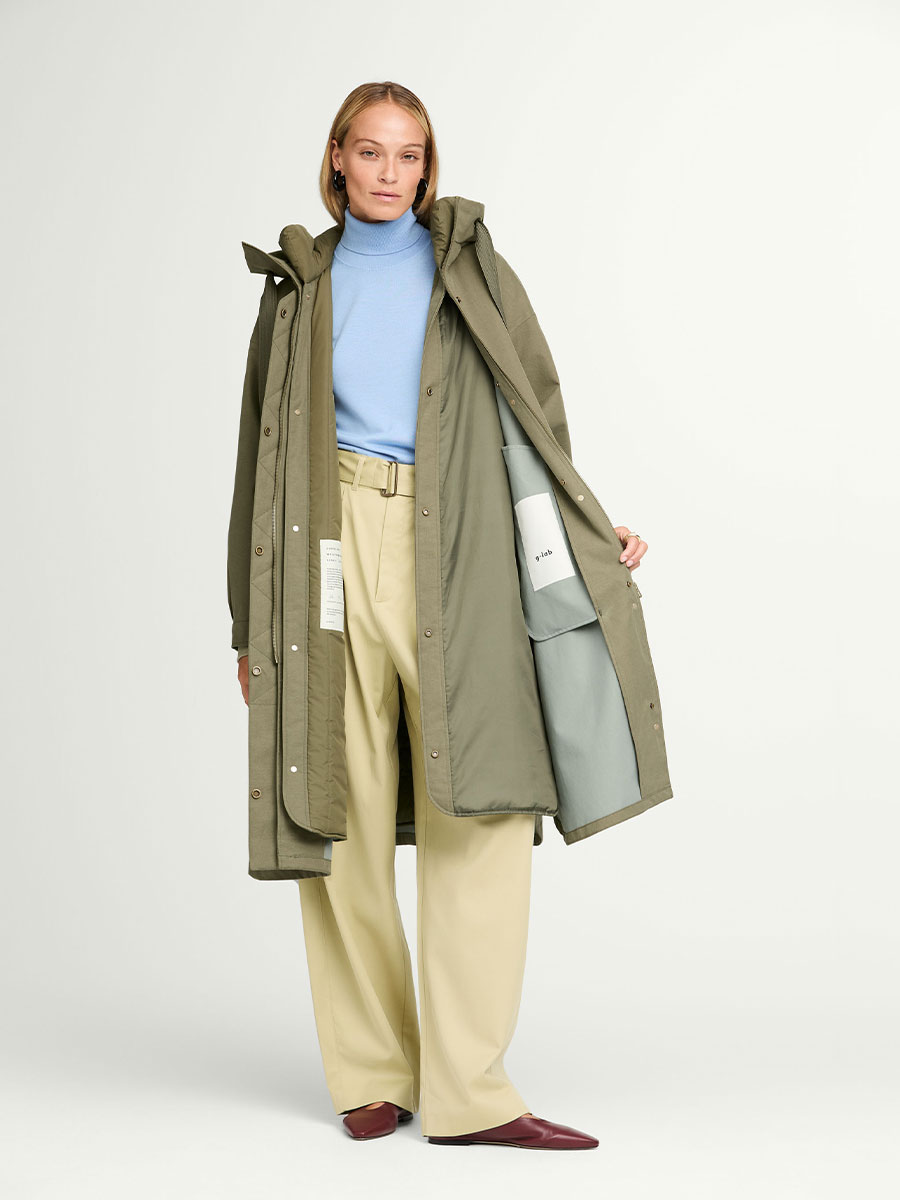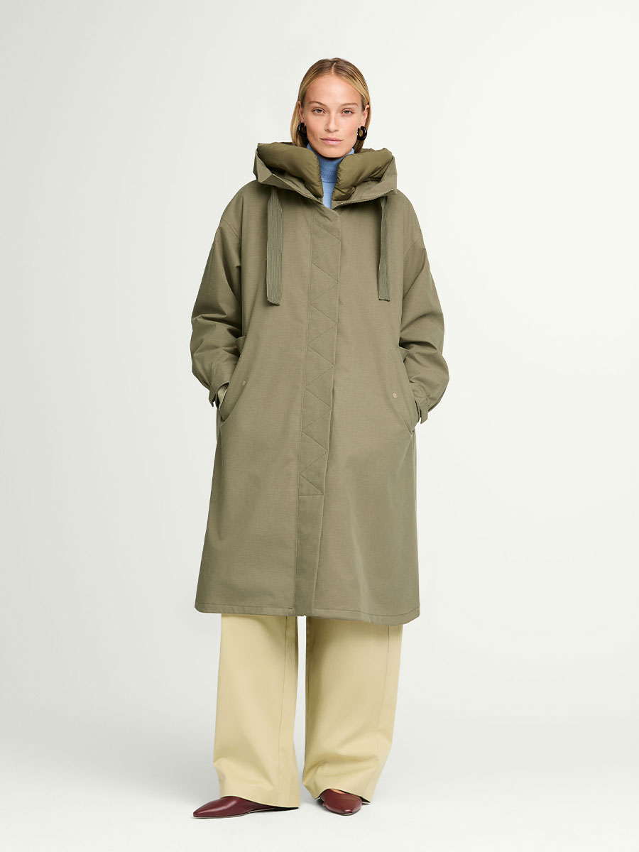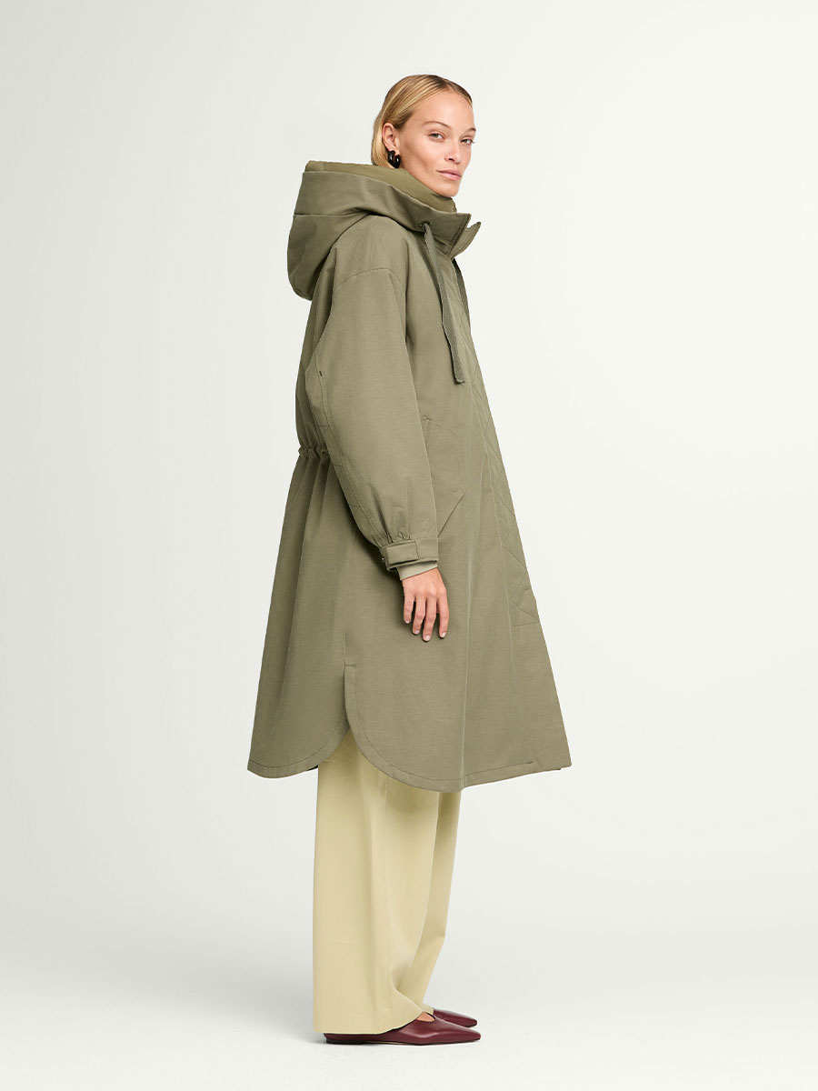 73% Tencel, 15% Leinen, 12% Baumwolle; Membran: 100% Polyurethan; Innenmaterial: 100% Polyester; Futter: 100% recyceltes Polyester; Wattierung: 100% recyceltes Polyester